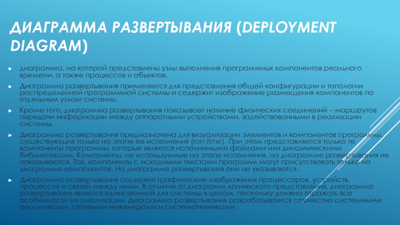 Диаграмма развертывания предназначена для визуализации элементов и компонентов программы, существующих только на этапе ее исполнения (run-time). При этом представляются только те компоненты программы, которые являются исполнимыми файлами или динамическими библиотеками. Компоненты, не используемые на этапе исполнения, на диаграмме развертывания не показываются. Так, компоненты с исходными текстами программ могут присутствовать только на диаграмме компонентов. На диаграмме развертывания они не указываются.