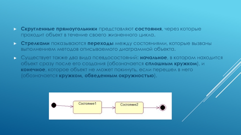 Слайд 33Скругленные прямоугольники представляют состояния, через которые проходит объект в течение своего