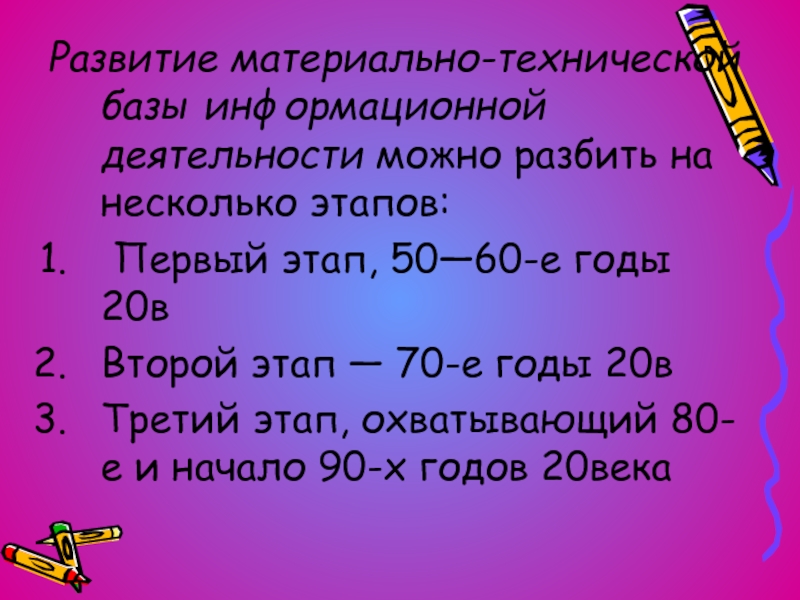 Слайд 10Развитие материально-технической базы информационной деятельности можно разбить на несколько этапов: