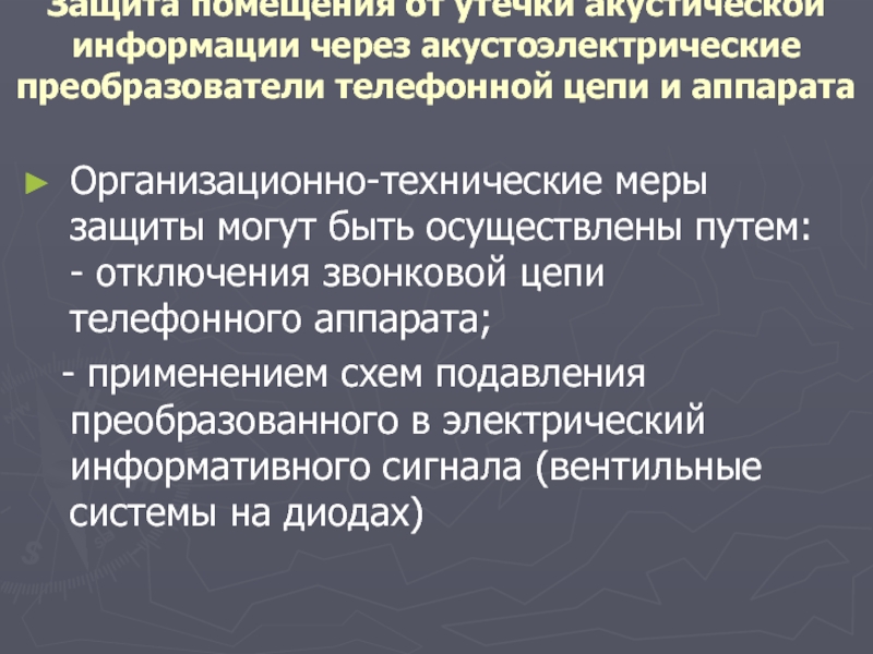 Организационно-технические меры защиты могут быть осуществлены путем: - отключения звонковой цепи телефонного аппарата;