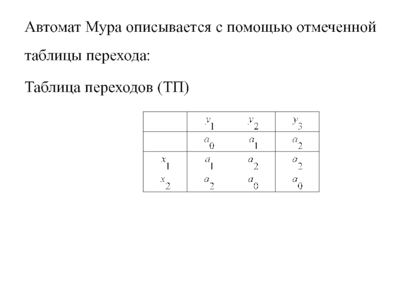 Слайд 13Автомат Мура описывается с помощью отмеченной таблицы перехода: