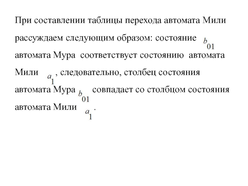 Слайд 44При составлении таблицы перехода автомата Мили рассуждаем следующим образом: состояние автомата