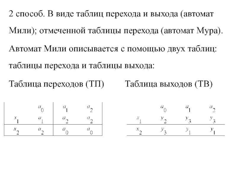 Слайд 122 способ. В виде таблиц перехода и выхода (автомат Мили); отмеченной