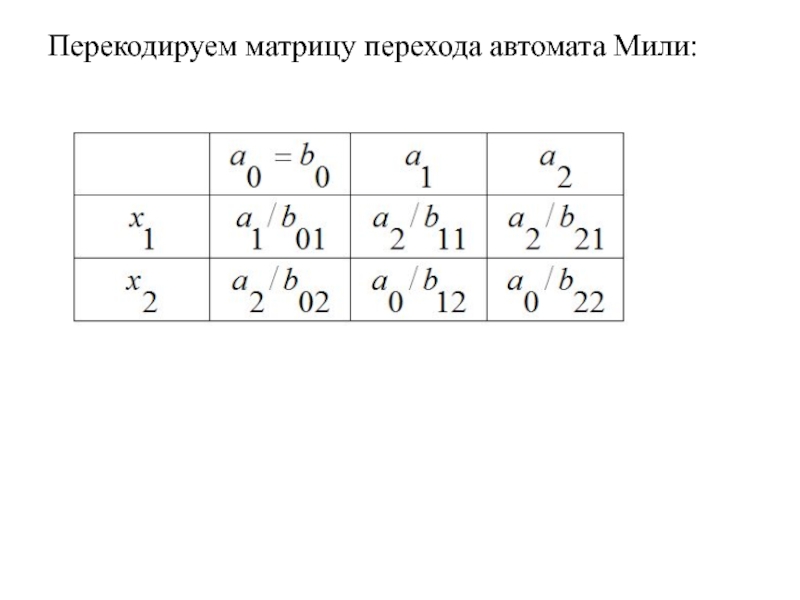Слайд 42Перекодируем матрицу перехода автомата Мили: