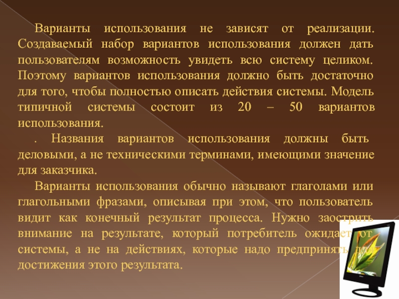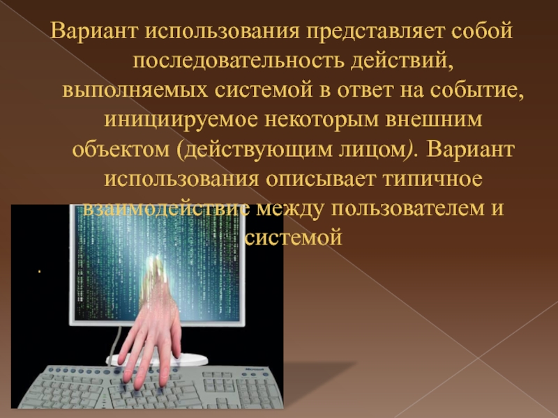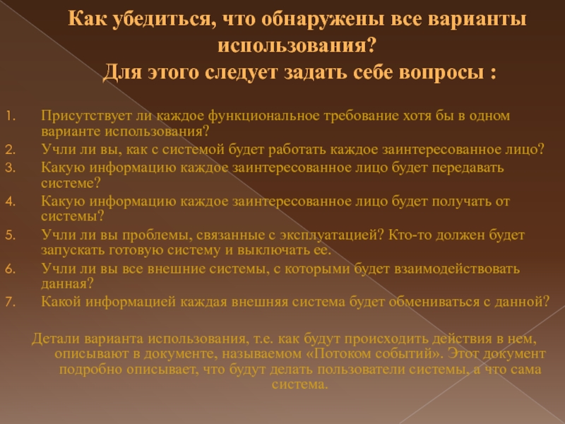 Детали варианта использования, т.е. как будут происходить действия в нем, описывают в документе, называемом «Потоком событий». Этот документ подробно описывает, что будут делать пользователи системы, а что сама система.