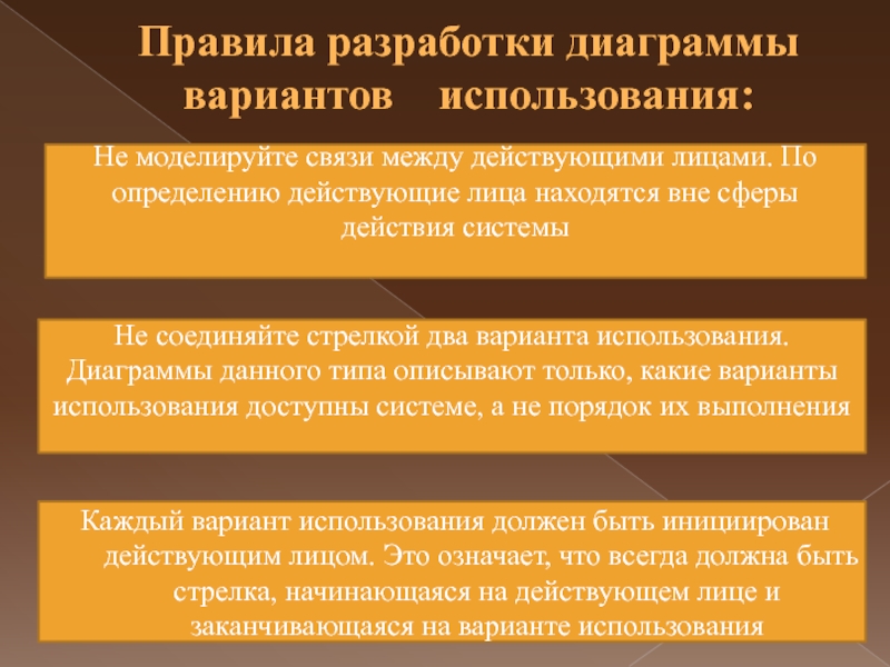 Каждый вариант использования должен быть инициирован действующим лицом. Это означает, что всегда должна быть стрелка, начинающаяся на действующем лице и заканчивающаяся на варианте использования