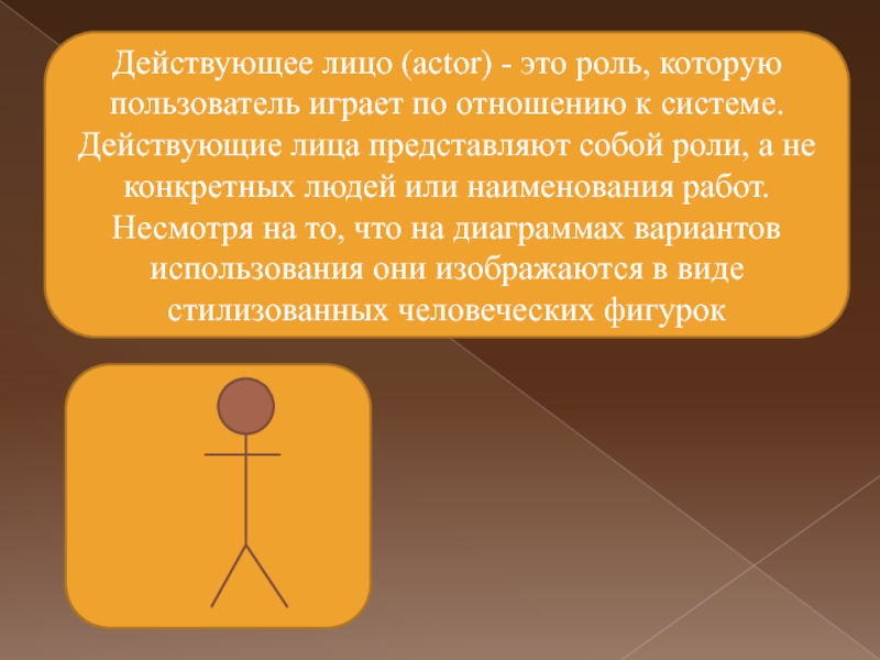 Действующее лицо (actor) - это роль, которую пользователь играет по отношению к системе. Действующие лица представляют собой роли, а не конкретных людей или наименования работ. Несмотря на то, что на диаграммах вариантов использования они изображаются в виде стилизованных человеческих фигурок
