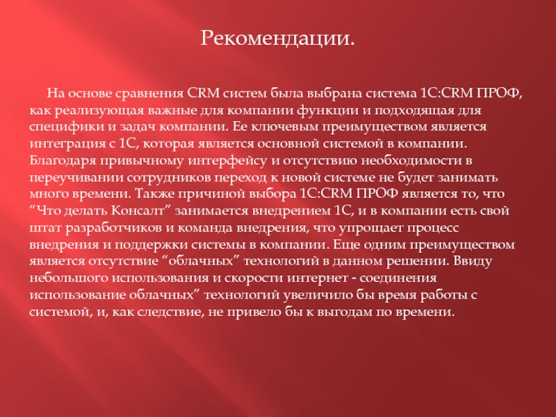 выбрана система 1С:CRM ПРОФ, как реализующая важные для компании функции и подходящая для специфики и задач компании. Ее ключевым преимуществом является интеграция с 1С, которая является основной системой в компании. Благодаря привычному интерфейсу и отсутствию необходимости в переучивании сотрудников переход к новой системе не будет занимать много времени. Также причиной выбора 1С:CRM ПРОФ является то, что “Что делать Консалт” занимается внедрением 1С, и в компании есть свой штат разработчиков и команда внедрения, что упрощает процесс внедрения и поддержки системы в компании. Еще одним преимуществом является отсутствие “облачных” технологий в данном решении. Ввиду небольшого использования и скорости интернет - соединения использование облачных” технологий увеличило бы время работы с системой, и, как следствие, не привело бы к выгодам по времени.