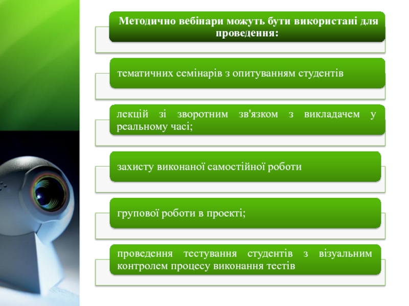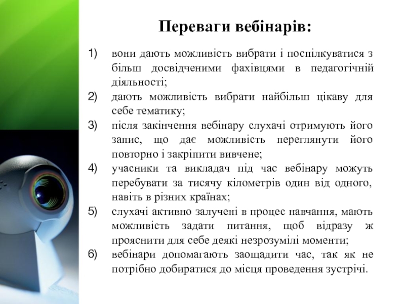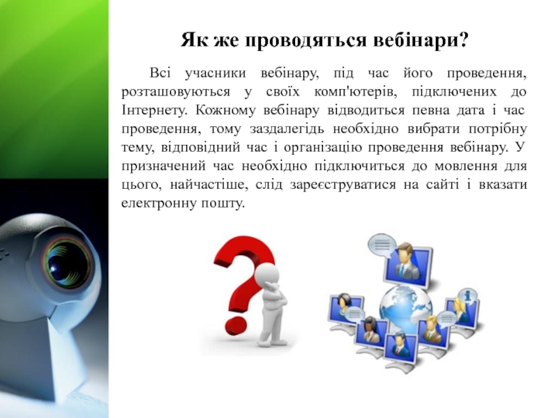 підключених до Інтернету. Кожному вебінару відводиться певна дата і час проведення, тому заздалегідь необхідно вибрати потрібну тему, відповідний час і організацію проведення вебінару. У призначений час необхідно підключиться до мовлення для цього, найчастіше, слід зареєструватися на сайті і вказати електронну пошту.