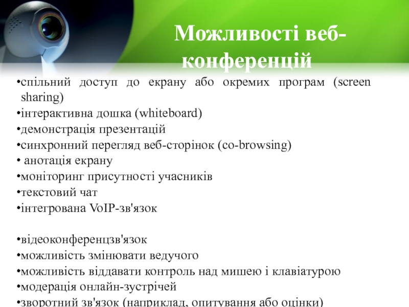 в режимі реального часу через Інтернет. Веб-конференції дозволяють проводити онлайн-презентації, спільно працювати з документами і додатками, синхронно переглядати сайти, відеофайли і зображення. При цьому кожен учасник знаходиться на своєму місці за комп'ютером.