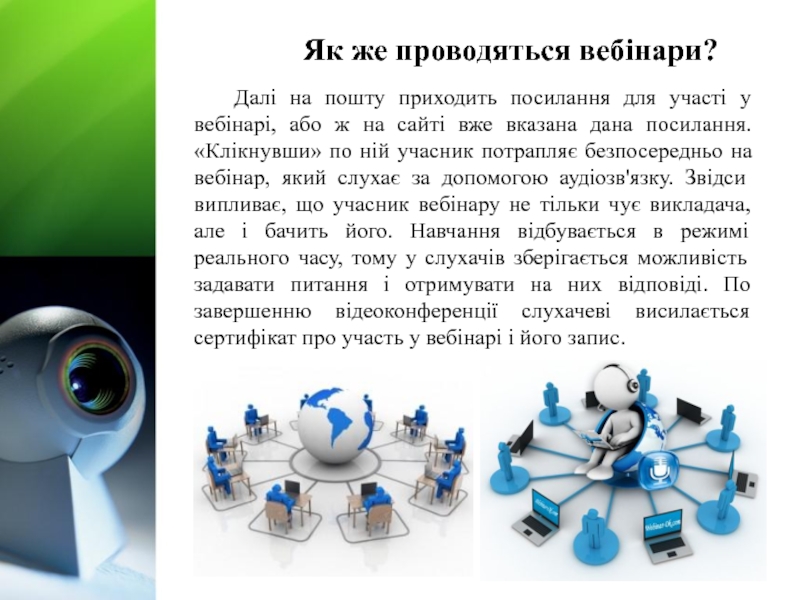 на сайті вже вказана дана посилання. «Клікнувши» по ній учасник потрапляє безпосередньо на вебінар, який слухає за допомогою аудіозв'язку. Звідси випливає, що учасник вебінару не тільки чує викладача, але і бачить його. Навчання відбувається в режимі реального часу, тому у слухачів зберігається можливість задавати питання і отримувати на них відповіді. По завершенню відеоконференції слухачеві висилається сертифікат про участь у вебінарі і його запис.