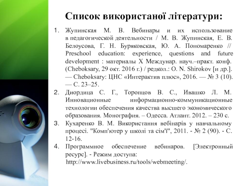 Кухаренко В. М. Використання вебінарів у навчальному процесі. "Комп'ютер у школі та сім'ї", 2011. - № 2 (90). - С. 12-16.