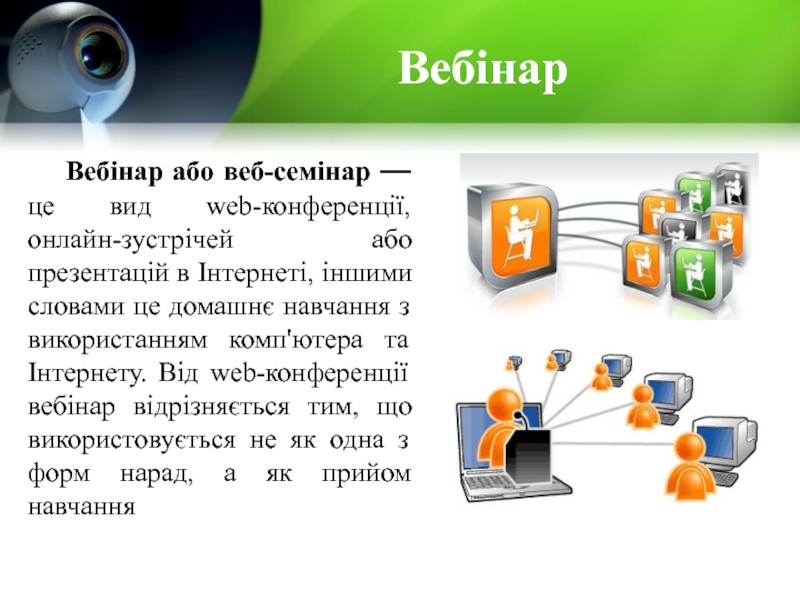 Інтернеті, іншими словами це домашнє навчання з використанням комп'ютера та Інтернету. Від web-конференції вебінар відрізняється тим, що використовується не як одна з форм нарад, а як прийом навчання