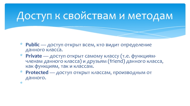 Private — доступ открыт самому классу (т.е. функциям-членам данного класса) и друзьям (friend) данного класса, как функциям, так и классам.