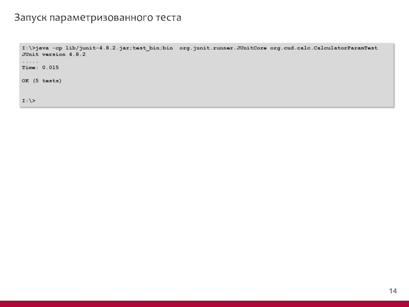 I:\>java -cp lib/junit-4.8.2.jar;test_bin;bin org.junit.runner.JUnitCore org.cud.calc.CalculatorParamTest