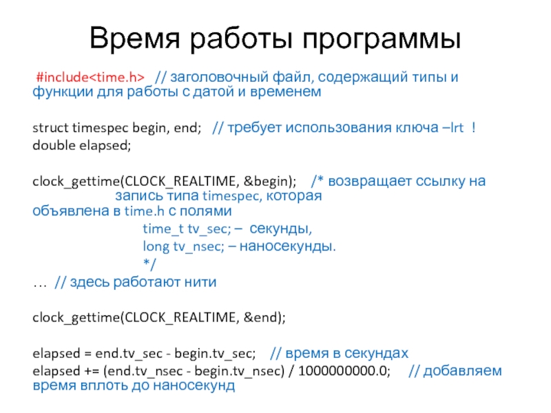clock_gettime(CLOCK_REALTIME, &begin); /* возвращает ссылку на запись типа timespec, которая объявлена в time.h с полями