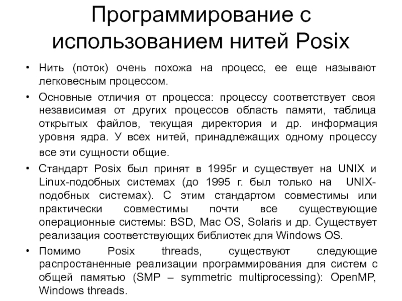 Помимо Posix threads, существуют следующие распростаненные реализации программирования для систем с общей памятью (SMP – symmetric multiprocessing): OpenMP, Windows threads.