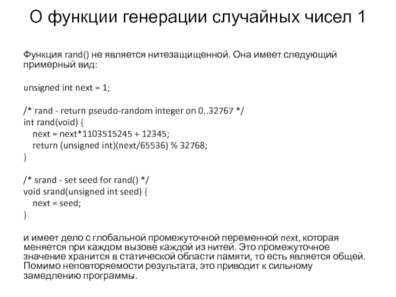 и имеет дело с глобальной промежуточной переменной next, которая меняется при каждом вызове каждой из нитей. Это промежуточное значение хранится в статической области памяти, то есть является общей. Помимо неповторяемости результата, это приводит к сильному замедлению программы.