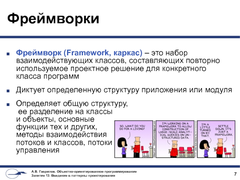 Фреймворк (Framework, каркас) – это набор взаимодействующих классов, составляющих повторно используемое