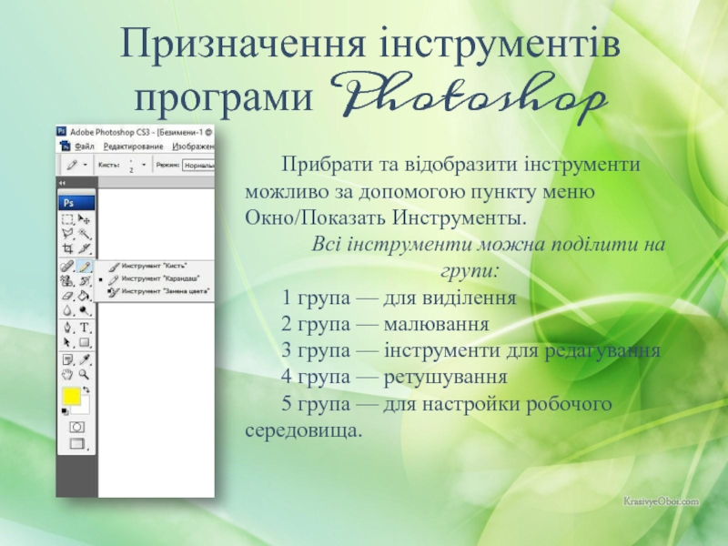Слайд 6Прибрати та відобразити інструменти можливо за допомогою пункту меню Окно/Показать Инструменты.