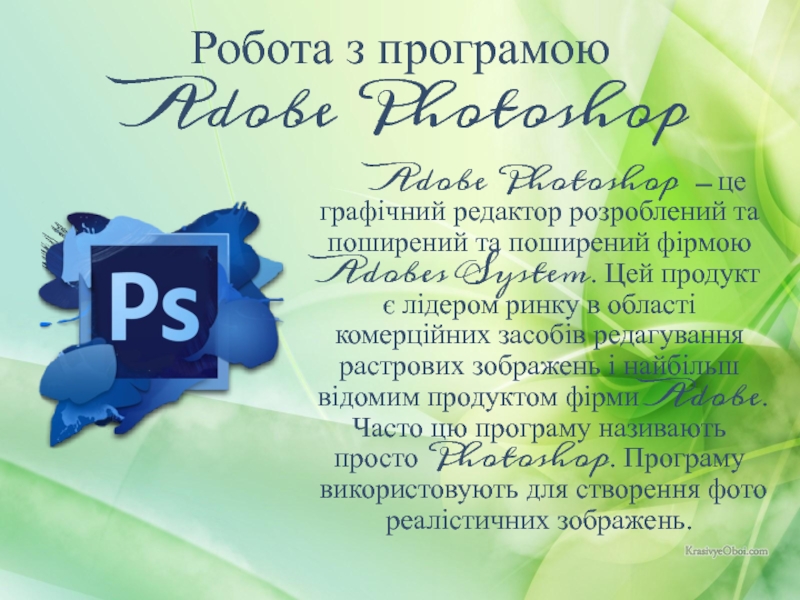 поширений фірмою Adobes System. Цей продукт є лідером ринку в області комерційних засобів редагування растрових зображень і найбільш відомим продуктом фірми Adobe. Часто цю програму називають просто Photoshop. Програму використовують для створення фото реалістичних зображень.