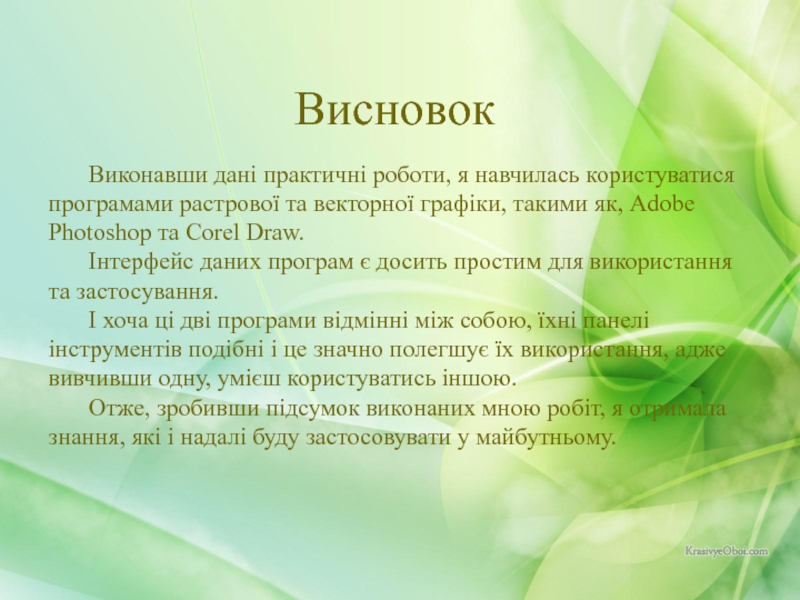 Слайд 21Виконавши дані практичні роботи, я навчилась користуватися програмами растрової та векторної