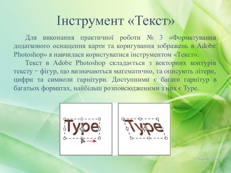 коригування зображень в Adobe Photoshop» я навчилася користуватися інструментом «Текст».
