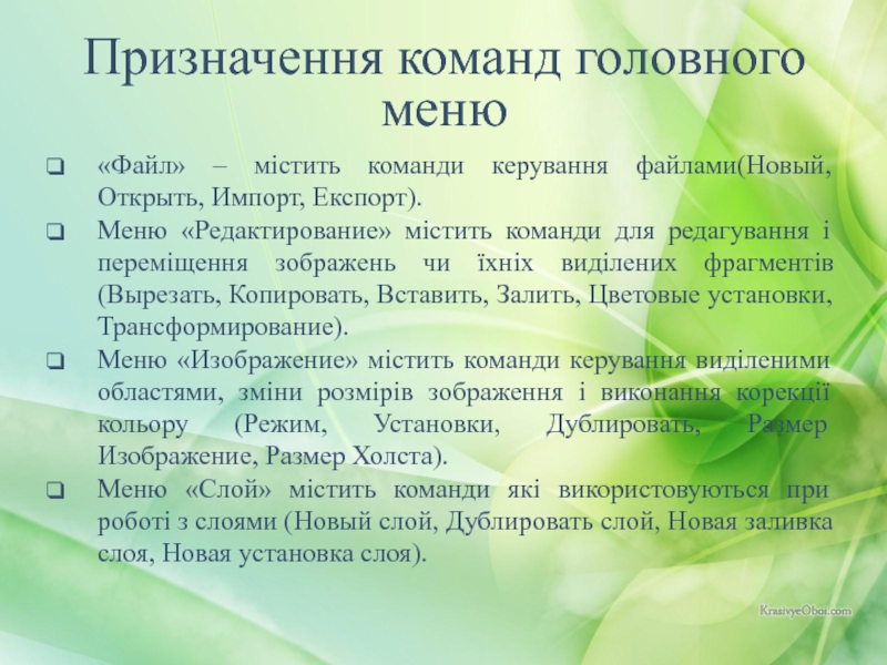Слайд 4«Файл» – містить команди керування файлами(Новый, Открыть, Импорт, Експорт).