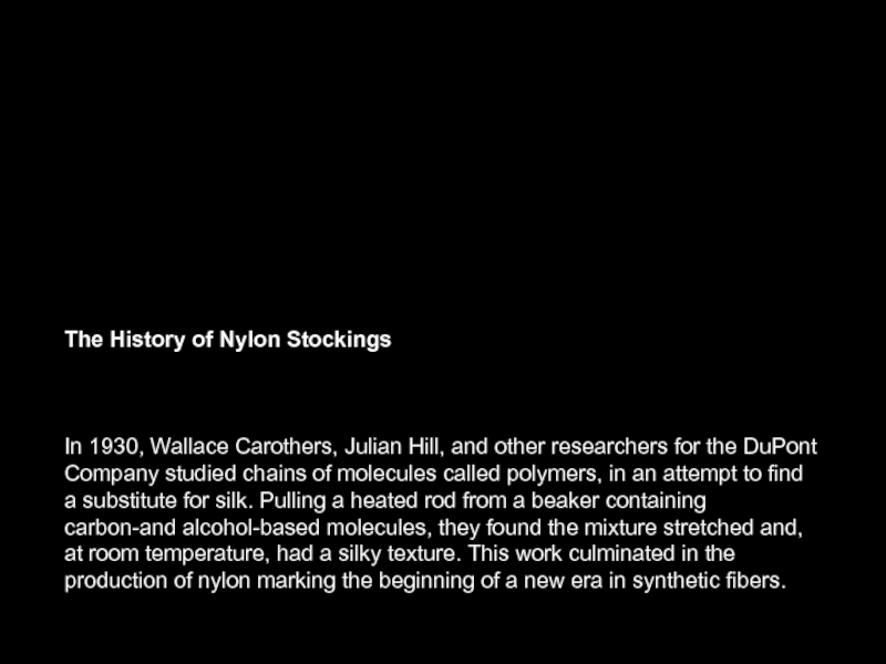 other researchers for the DuPont Company studied chains of molecules called polymers, in an attempt to find a substitute for silk. Pulling a heated rod from a beaker containing carbon-and alcohol-based molecules, they found the mixture stretched and, at room temperature, had a silky texture. This work culminated in the production of nylon marking the beginning of a new era in synthetic fibers.