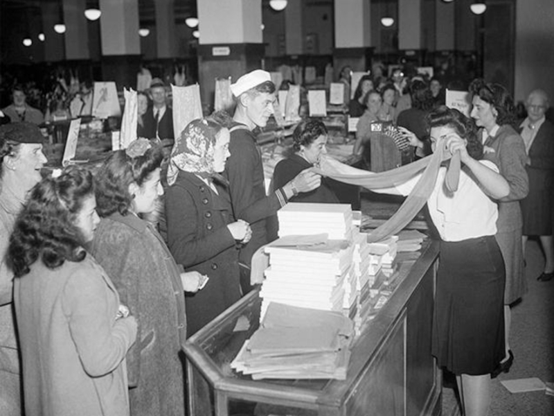 and nylon stockings in an American department store during the war. The donor is wearing socks, another alternative to stockings.