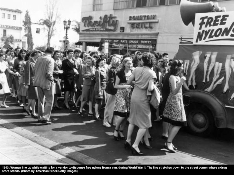 Слайд 28First postwar nylon sale in San Francisco was so mobbed that