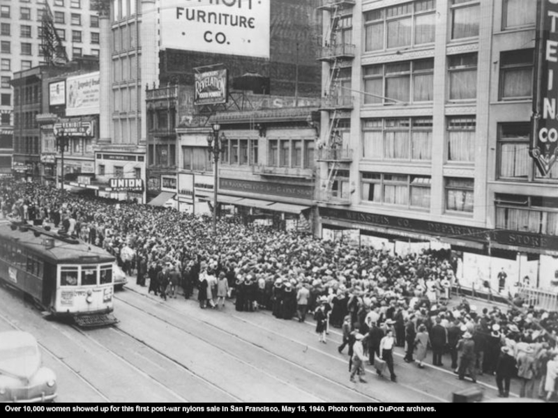 when rations were eased after the war, led to queues that ran out the doors and down the block -- leading to “nylon riots” in some places. Some 40,000 women lined up outside a store in Pittsburgh that had 13,000 stockings, while a shop in San Francisco had to stop selling stockings after it was mobbed by 10,000 people. Demand stayed so high throughout the 1940s that DuPont demanded payment in advance for all purchases, even from the most reputable of accounts.