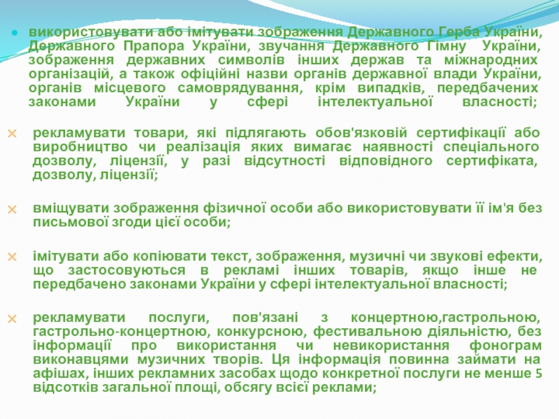 Слайд 25використовувати або імітувати зображення Державного Герба України, Державного Прапора України, звучання