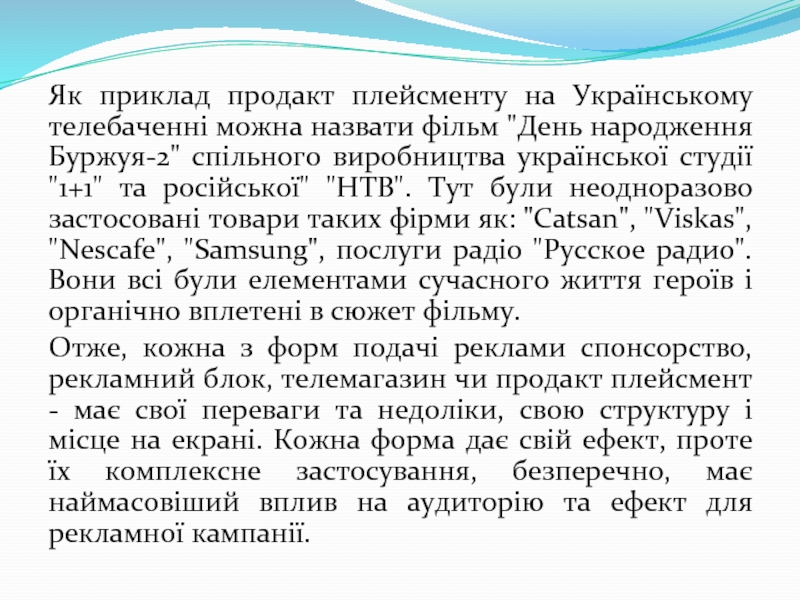 Слайд 7Як приклад продакт плейсменту на Українському телебаченні можна назвати фільм "День