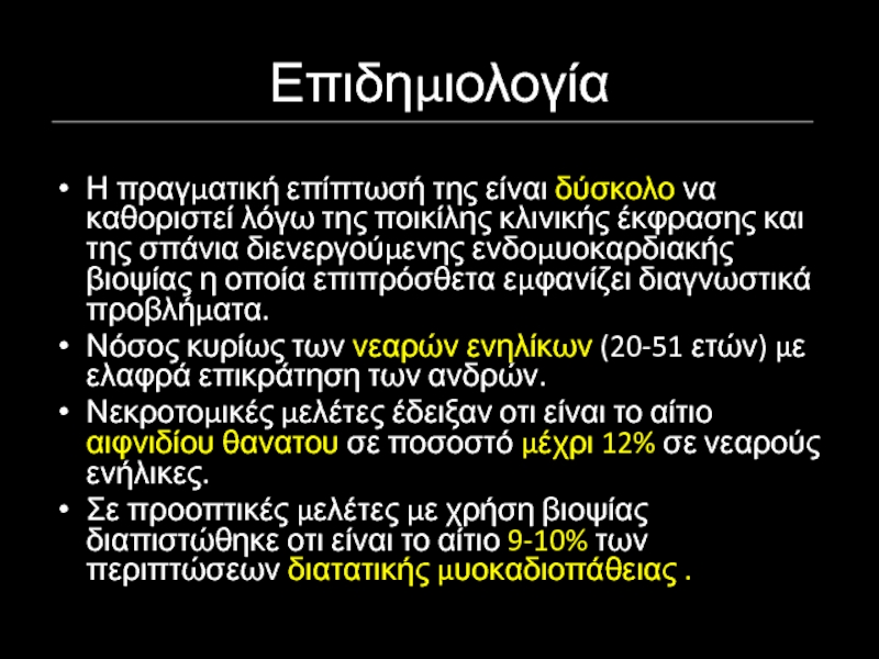 διαγνώσεις στην Καρδιολογία λόγω της εξαιρετικής μεταβλητότητας στην κλινική παρουσίαση και εξέλιξη και της μειωμένης ευαισθησίας των συνηθισμένων διαγνωστικών εξετάσεων .