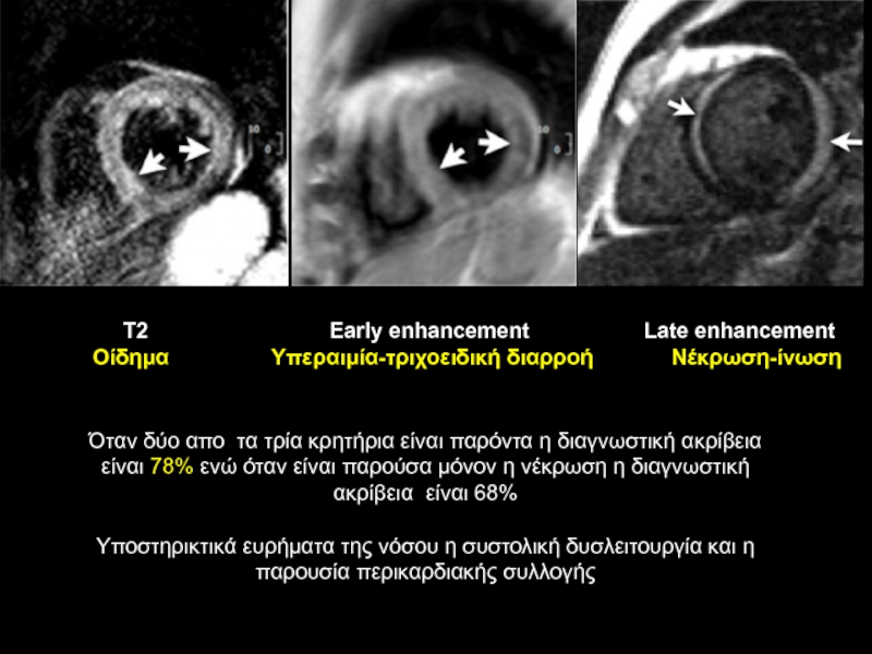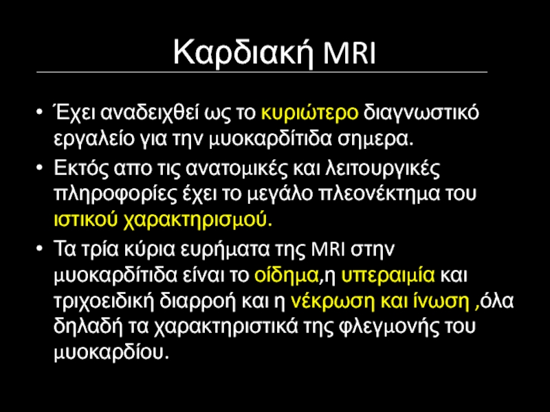 Τα τρία κύρια ευρήματα της MRI στην μυοκαρδίτιδα είναι το οίδημα,η υπεραιμία και τριχοειδική διαρροή και η νέκρωση και ίνωση ,όλα δηλαδή τα χαρακτηριστικά της φλεγμονής του μυοκαρδίου.