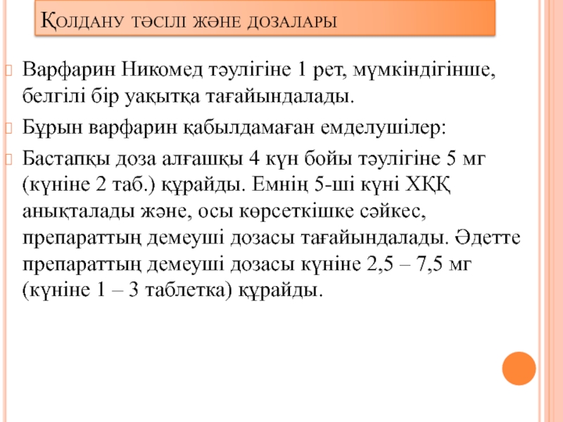 мг, ұзақтығы: тұрақсыз стенокардия; миокардтың инфаркты (40-325 мг 1 рет тәулігіне); Ишемиялық инсульт және өтпелі мидың ишемиясы – 160 -300 мг/тәу 48 сағат бойы болжалданған инсульттың басталуынан кейін. Аортоартериит (Такаясу ауруы)В. Қайталанушы ӨАТЭ, өкпе инфаркты. Жедел тромбофлебит. Дресслер синдромы. Жедел ревматизмдік қызба, ревматоидты артрит, созылмалы полиартрит – тәуліктік мөлшерде 5-8 г ересектер үшін және 150-200 мг өмірдің 1 жылында Т.Б