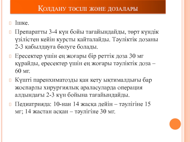 Күшті паренхиматозды қан кету ықтималдығы бар жоспарлы хирургиялық араласуларда операция алдындағы 2-3 күн бойына тағайындайды.