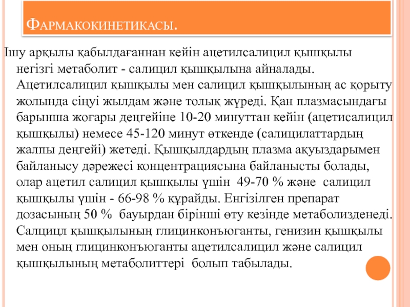 Слайд 6Препарат организмнен метаболиттер түрінде негізінен бүйрек арқылы шығарылады. Ацетилсалицил қышқылының жартылай