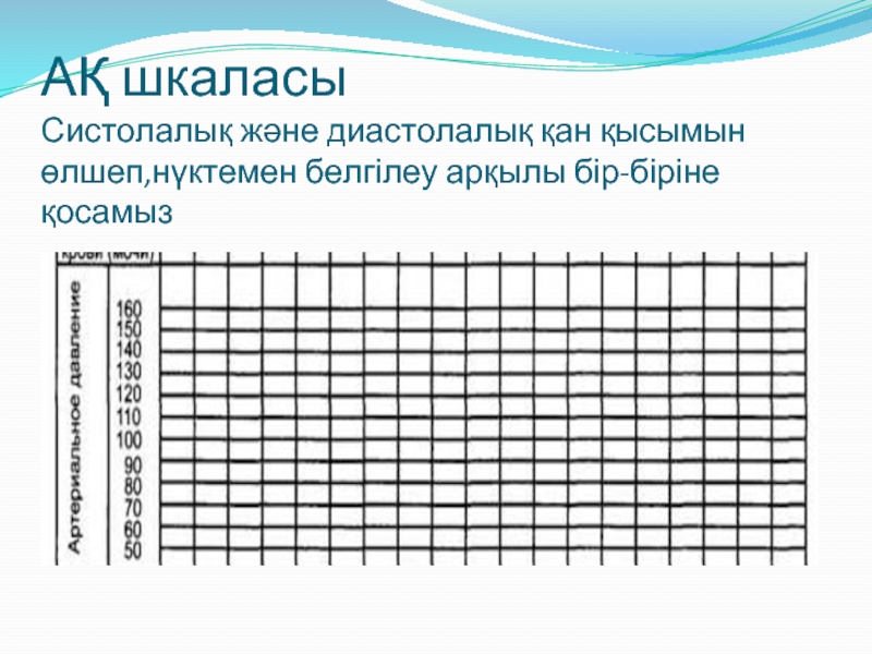 Слайд 8АҚ шкаласы Систолалық және диастолалық қан қысымын өлшеп,нүктемен белгілеу арқылы бір-біріне қосамыз