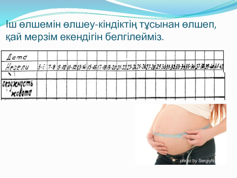 Слайд 9Іш өлшемін өлшеу-кіндіктің тұсынан өлшеп,қай мерзім екендігін белгілейміз.
