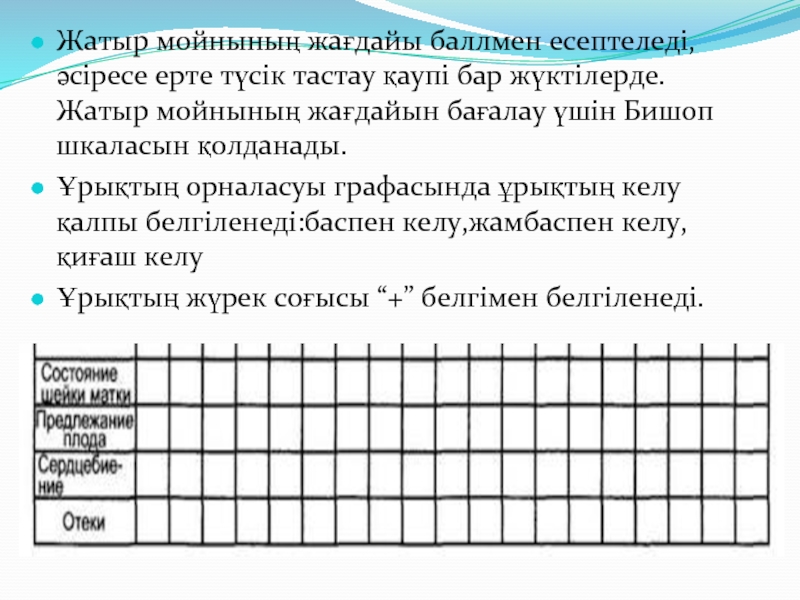 Слайд 12Жатыр мойнының жағдайы баллмен есептеледі, әсіресе ерте түсік тастау қаупі бар