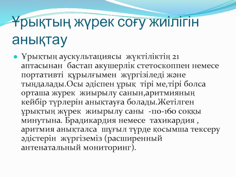 Слайд 20Ұрықтың жүрек соғу жиілігін анықтау