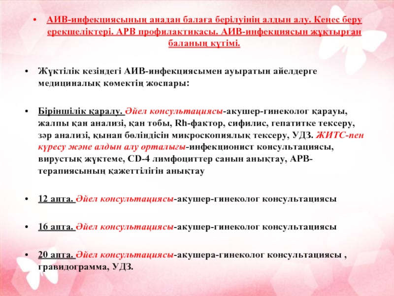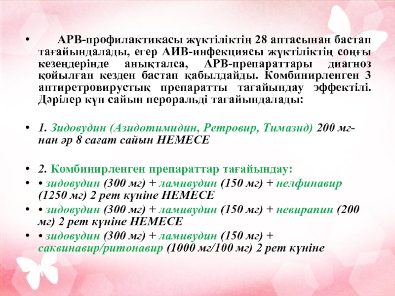 Слайд 42 АРВ-профилактикасы жүктіліктің 28 аптасынан бастап тағайындалады, егер АИВ-инфекциясы