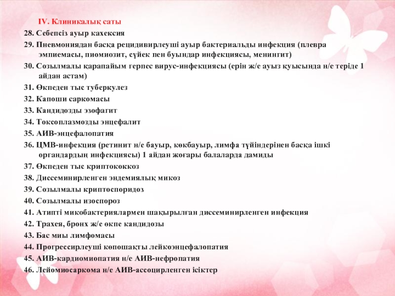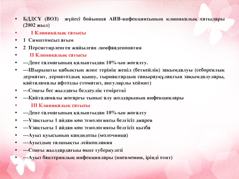 Слайд 16БДДСҰ (ВОЗ) жүйесі бойынша АИВ-инфекциясының клиникалық сатылары (2002 жыл)