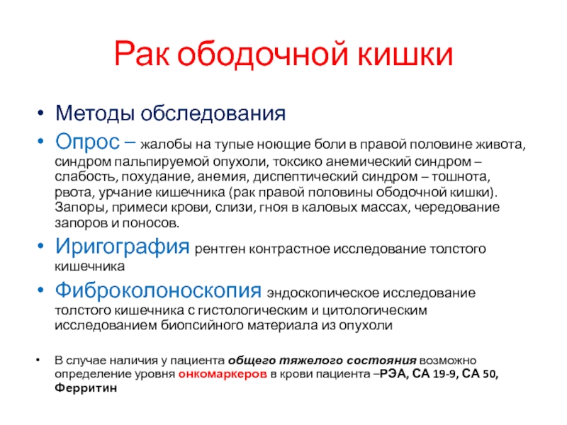 правой половине живота, синдром пальпируемой опухоли, токсико анемический синдром – слабость, похудание, анемия, диспептический синдром – тошнота, рвота, урчание кишечника (рак правой половины ободочной кишки). Запоры, примеси крови, слизи, гноя в каловых массах, чередование запоров и поносов.