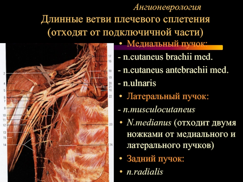 N.medianus (отходит двумя ножками от медиального и латерального пучков)