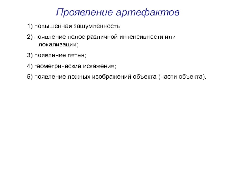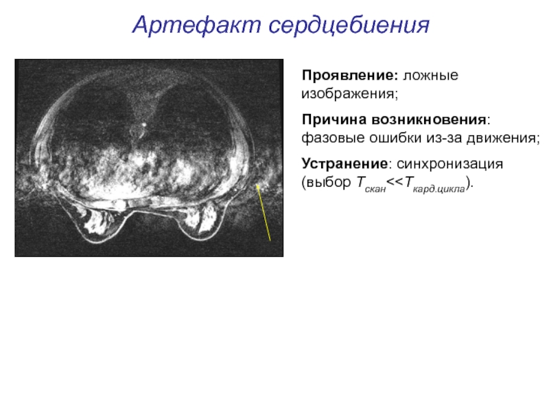 Проявление: ложные изображения объекта; гиперинтенсивный сигнал с симметрией относительно центральной
