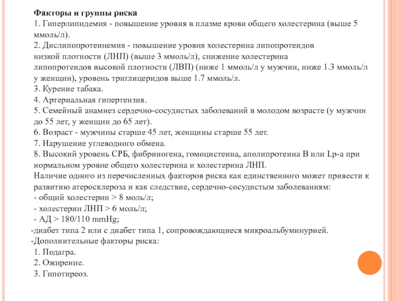 2. Дислипопротеинемия - повышение уровня холестерина липопротеидов низкой плотности (ЛНП) (выше 3 ммоль/л), снижение холестерина липопротеидов высокой плотности (ЛВП) (ниже 1 ммоль/л у мужчин, ниже 1.3 ммоль/л у женщин), уровень триглицеридов выше 1.7 ммоль/л.
