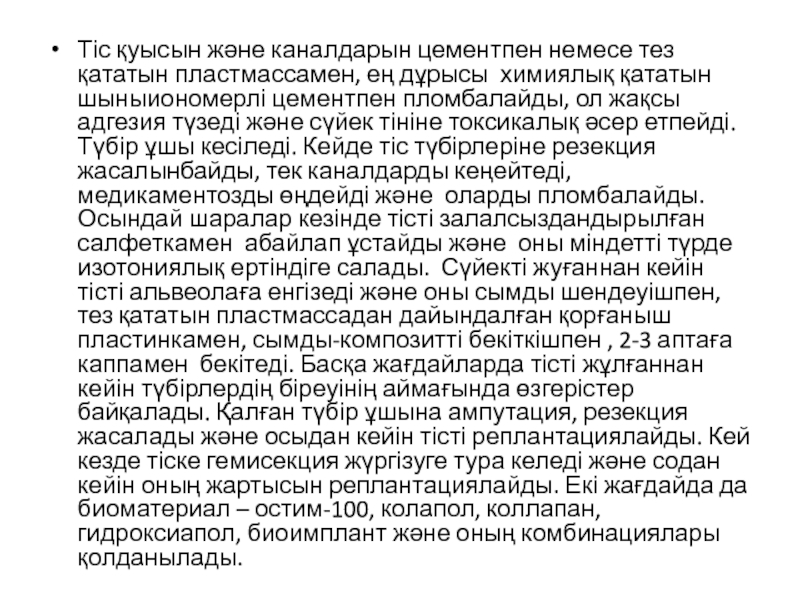 Слайд 6Тіс қуысын және каналдарын цементпен немесе тез қататын пластмассамен, ең дұрысы